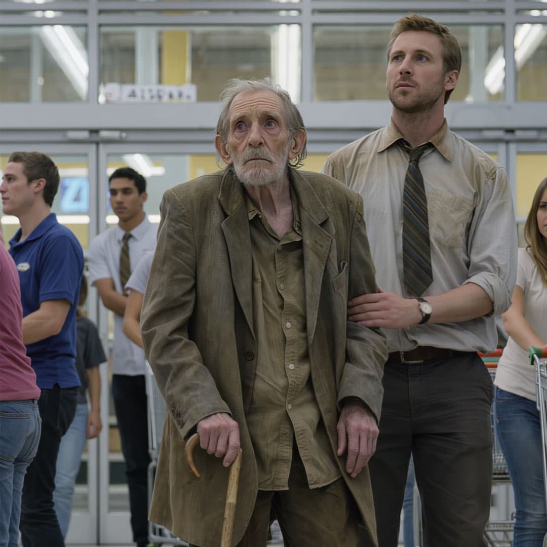 Un matin, il choisit délibérément une tenue modeste, laisse son apparence se dégrader et sa barbe pousser librement. Il entre dans son propre commerce en se donnant l’allure d’un homme âgé en situation précaire.