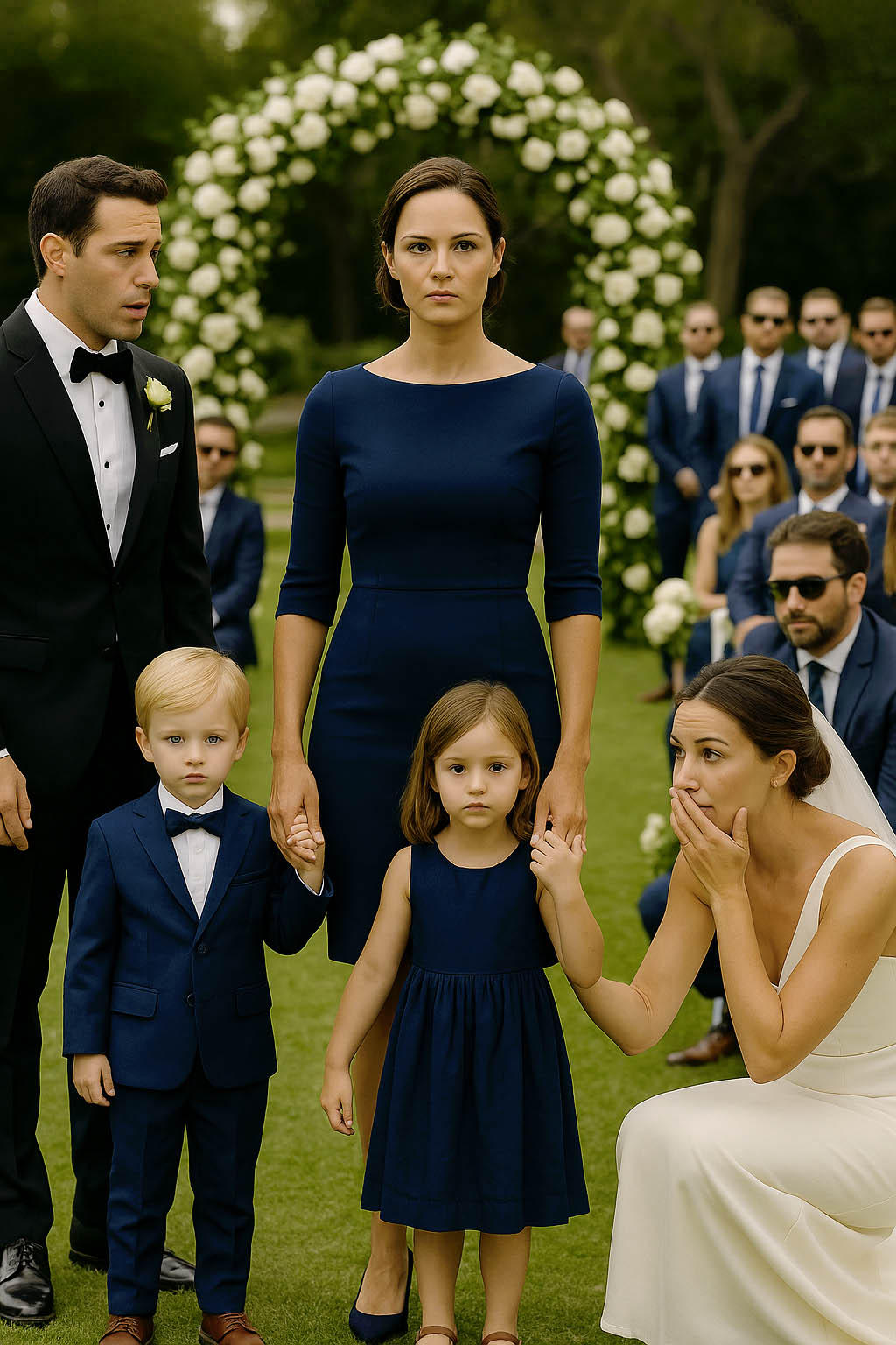 Soudain, il l’aperçut : Léa, vêtue d’une tenue marine discrète mais raffinée, coiffure sage… et deux enfants juchés à ses côtés. Un petit garçon et une fillette, manifestement jumeaux.