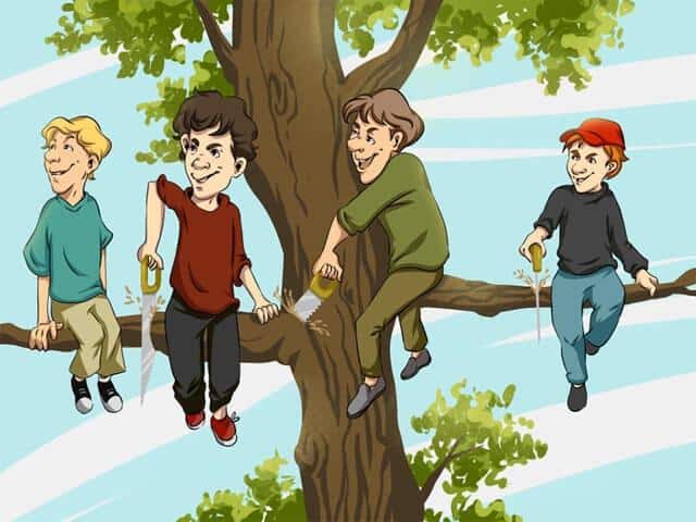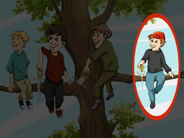 Si vous avez repéré le garçon au chapeau rouge (numéro 4) comme celui qui commet la plus grave erreur, bravo ! C’est effectivement lui qui fait la faute la plus évidente. Il scie directement la partie de bois qui lui sert de siège, ce qui le condamne à une chute certaine.